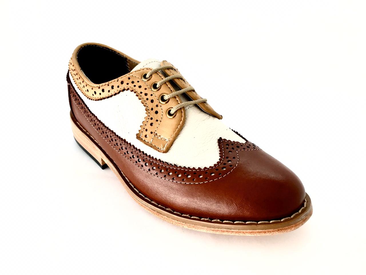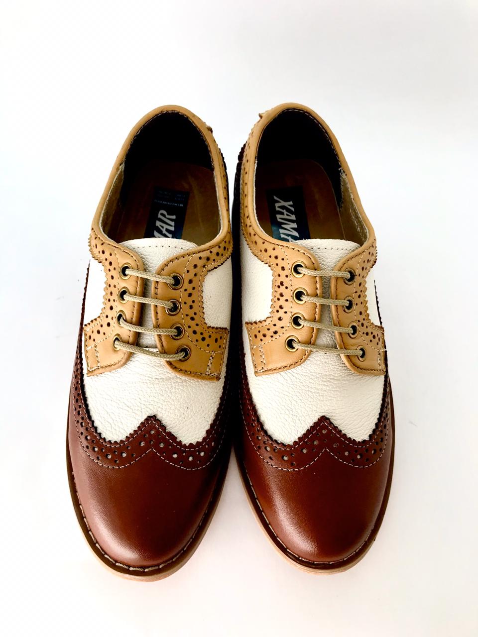 Corte: Vacuno Color: Coñac, Blanco y Camel Suela: Cuero Tapa: de cuero con base de firme.