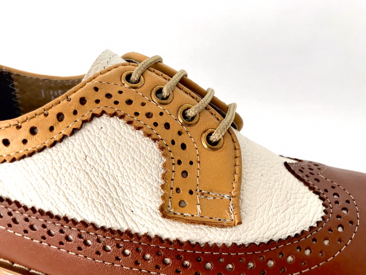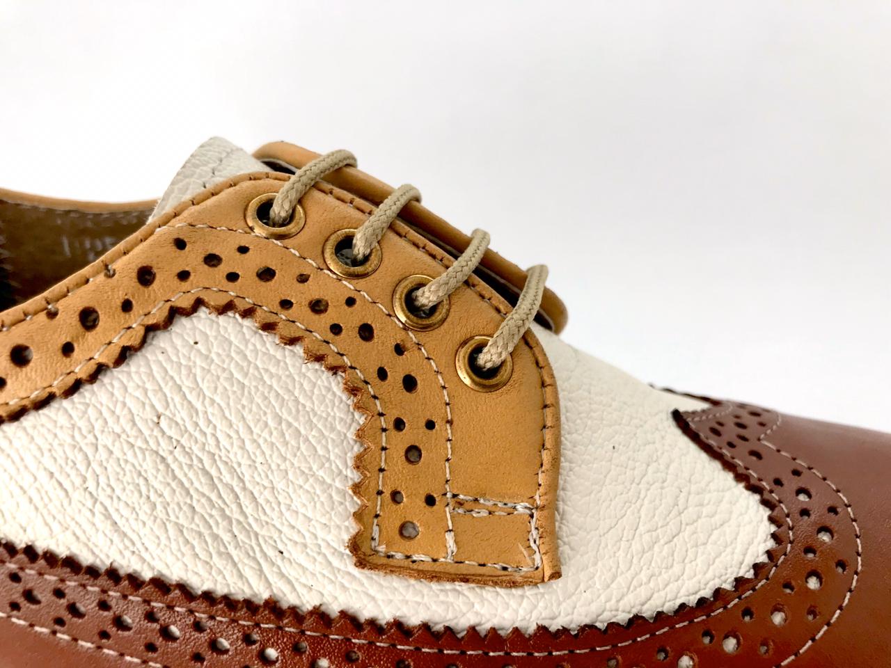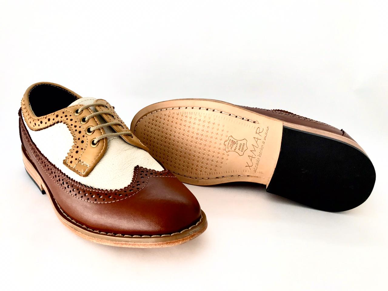 Calzado Derby tipo bostoniano Brogue de Bigotera (Long Wingtips) en combinación de piel lisa y piel tipo Floter con algunos cortes escamados y costuras que resaltan los colores de la piel, suela de cuero con cerco especial, mezcla elementos de tradición y modernidad.