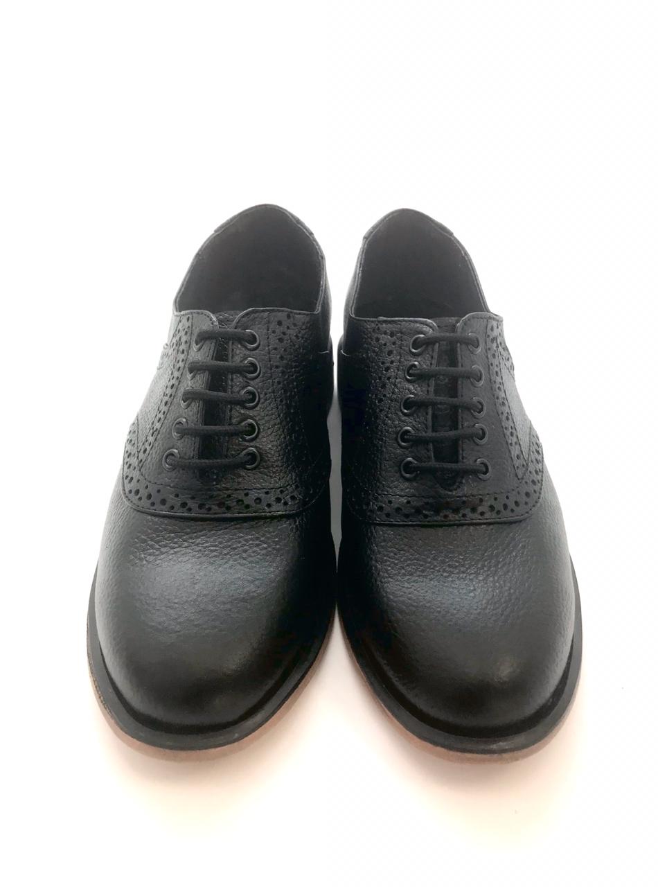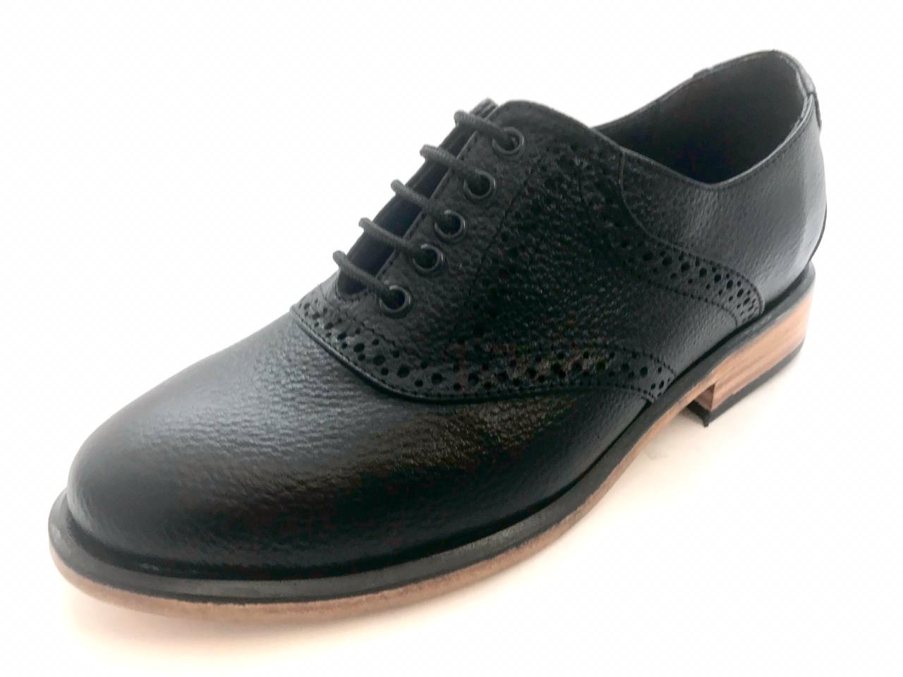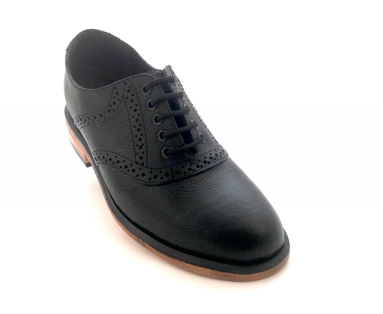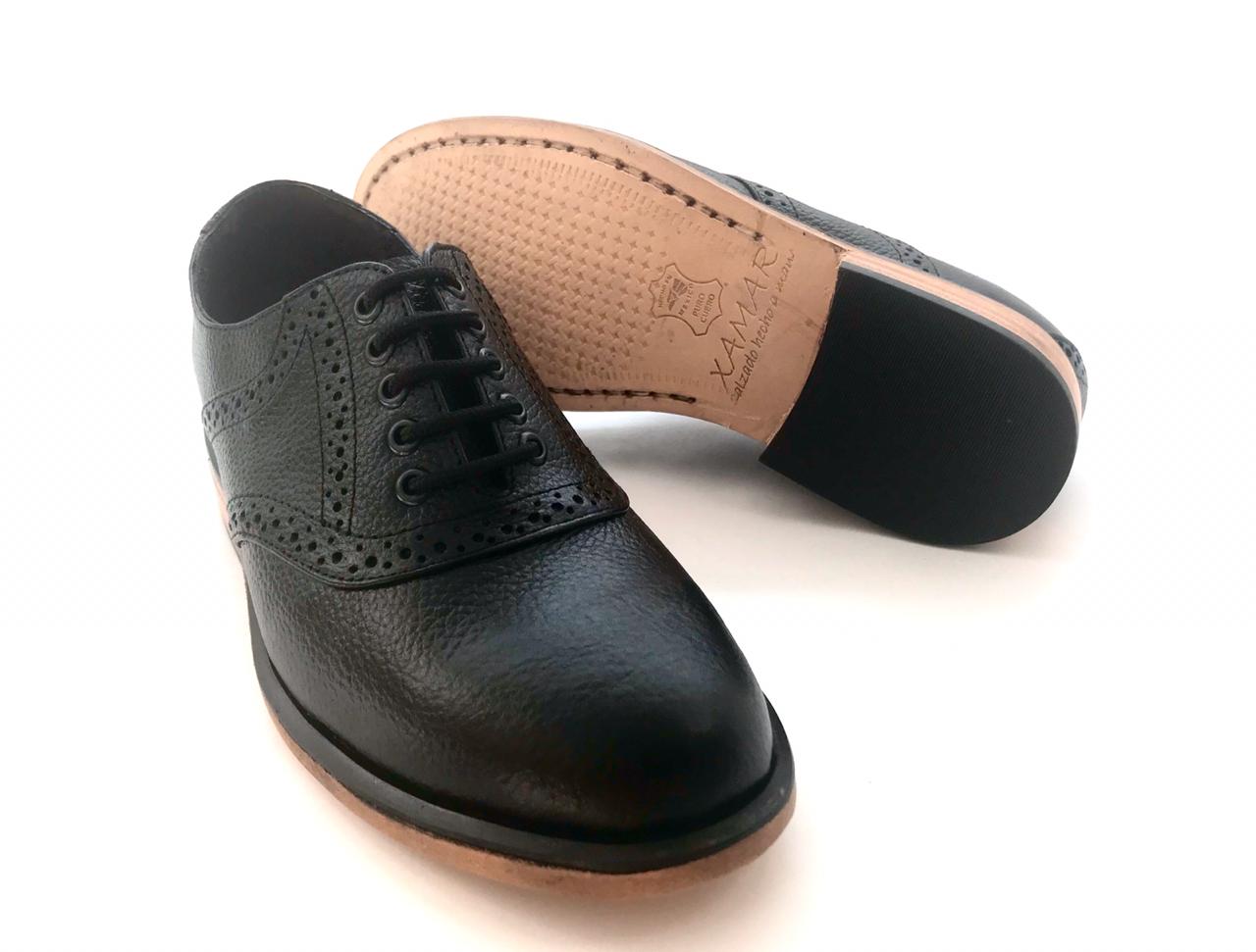 Calzado Saddle (montura) Oxford tipo Bostoniano Brogue en piel tipo floter, suela de cuero con cerco dentado especial, mezcla elementos de tradición y modernidad