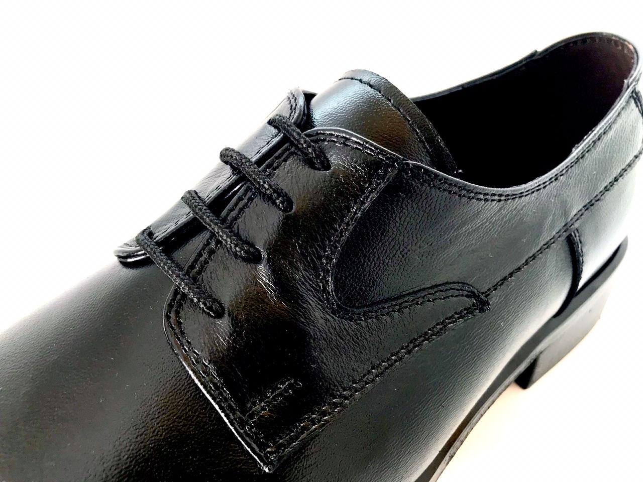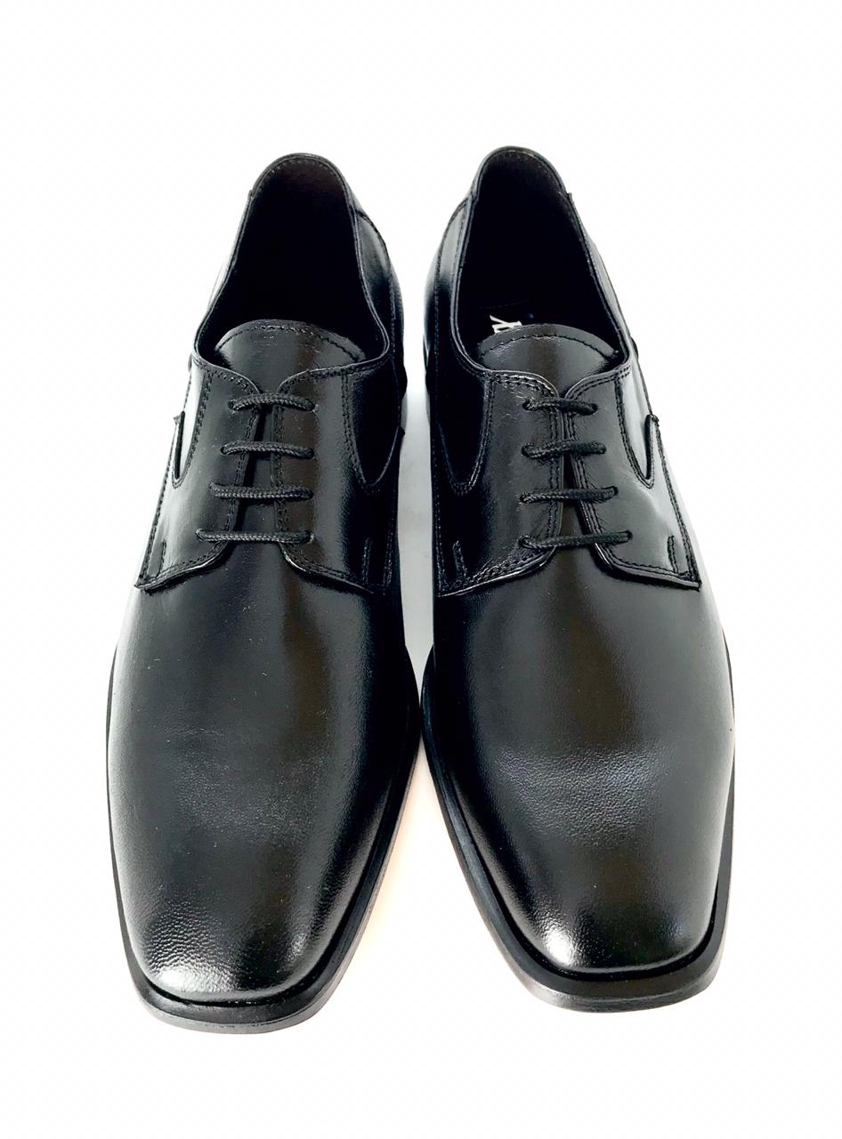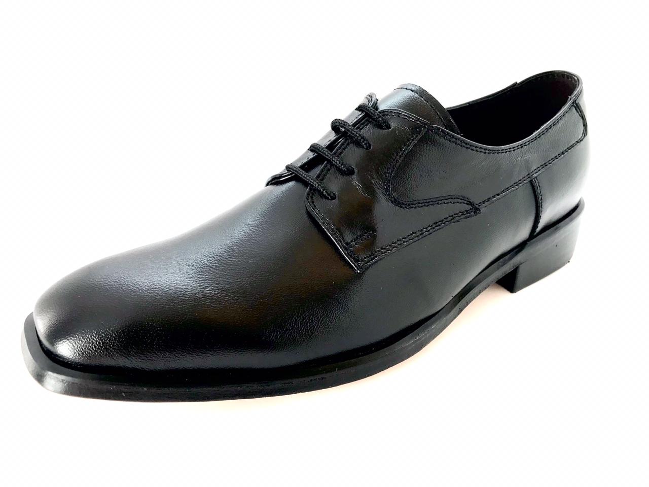 Calzado Derby de punta lisa en suave piel de cabra con suela de cuero, ideal para oficia y uso en eventos formales un diseño limpio y elegante.